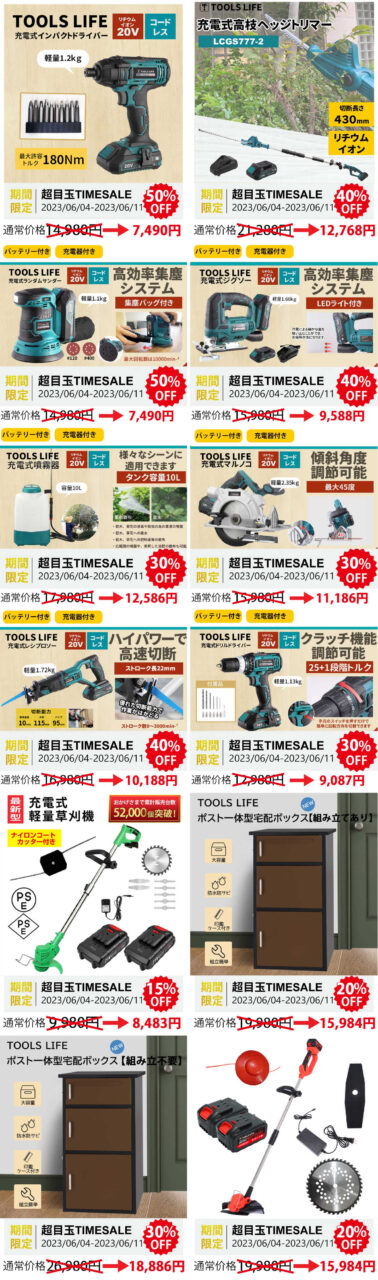 現在開催中の楽天スーパーセールで「TOOLS LIFE」ブランドのDIY製品が期間中半額で購入できます!コストパフォーマンスが高い製品としてDIY愛好者に高評価を受けている電動工具が今なら半額で購入できるチャンスです。是非、スーパーセール会場にお越しください。