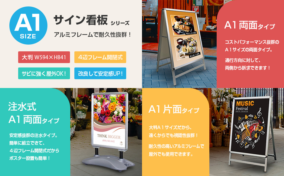 A1サイズポスターフレーム看板は、軽量で耐久性の高いアルミフレーム、屋外でも使える防錆加工、大判のA1サイズだから遠くからの視認性も良い、3種類の看板からお選びいただける看板です。