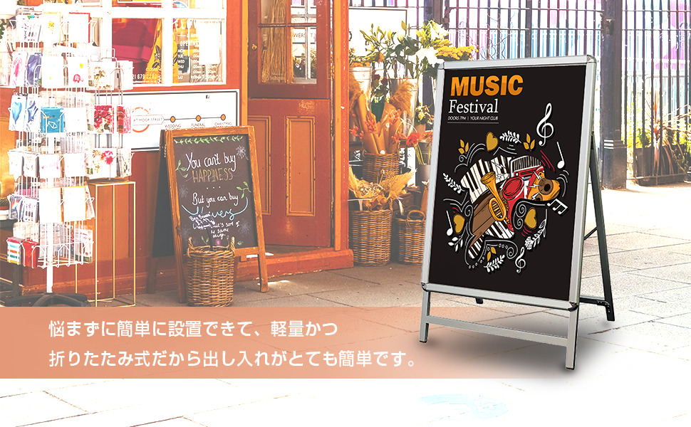 A1サイズポスターフレーム看板は、軽量で耐久性の高いアルミフレームを使用しています。そのため、持ち運びや設置が簡単で、風や雨に強いため屋外でも安心して使用できます。