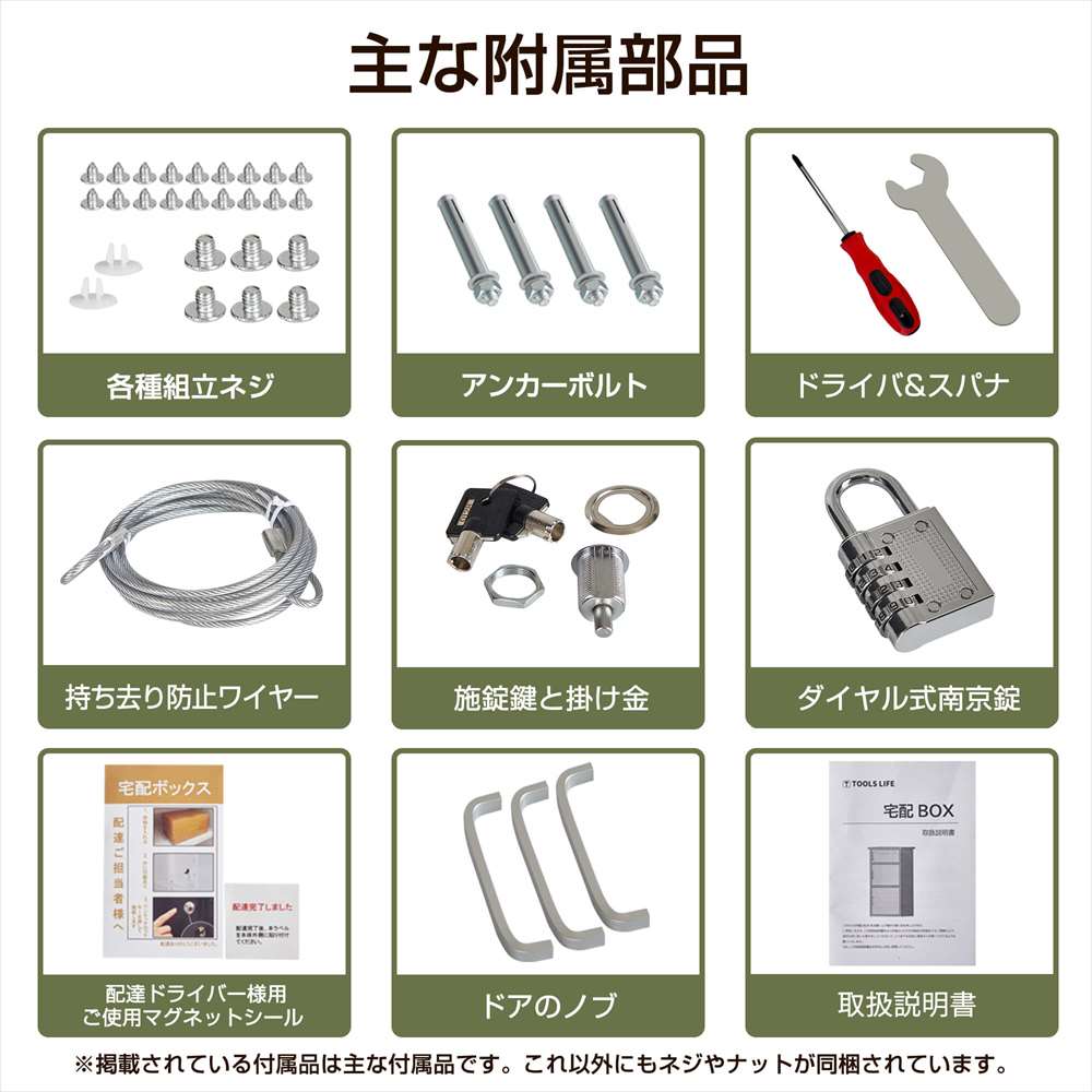 アンカーボルトを取り付けることで、「宅配ボックス付きポスト」が固定され、自然災害等、転倒などを防ぎ安心盗難防止金具に付属のワイヤーを通し、ダイヤル式南京錠をつけることで、2重の防犯対策になり安心