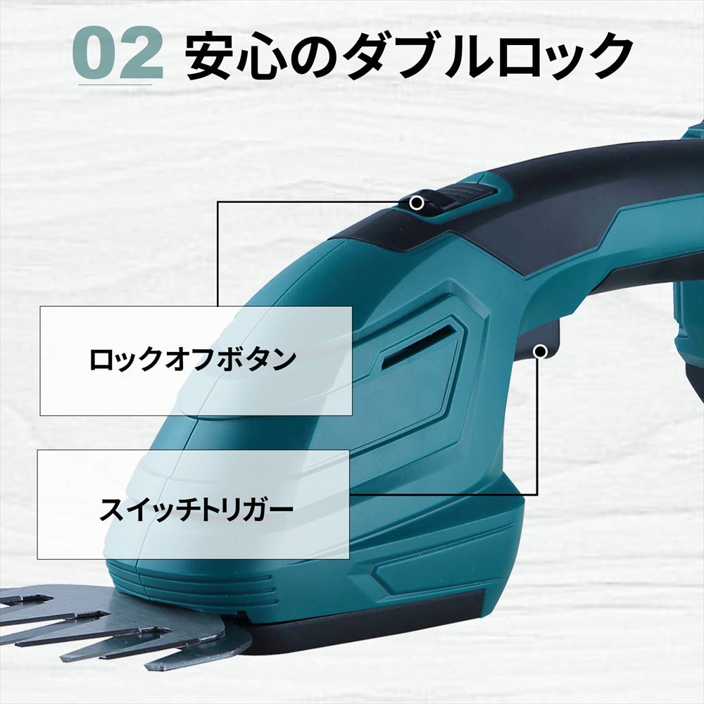 ブレードの組み立ては簡単に交換できるので、状況に合わせてスムーズに作業することができます。使用時の安全を確保するために、安全ボタンとハンドルボタンを同時に押すときのみ製品が始動します。誤操作による損傷を防止します。