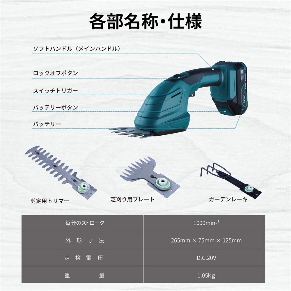 芝刈り用ブレード・剪定用トリマー・ガーデンレーキが付属しています。