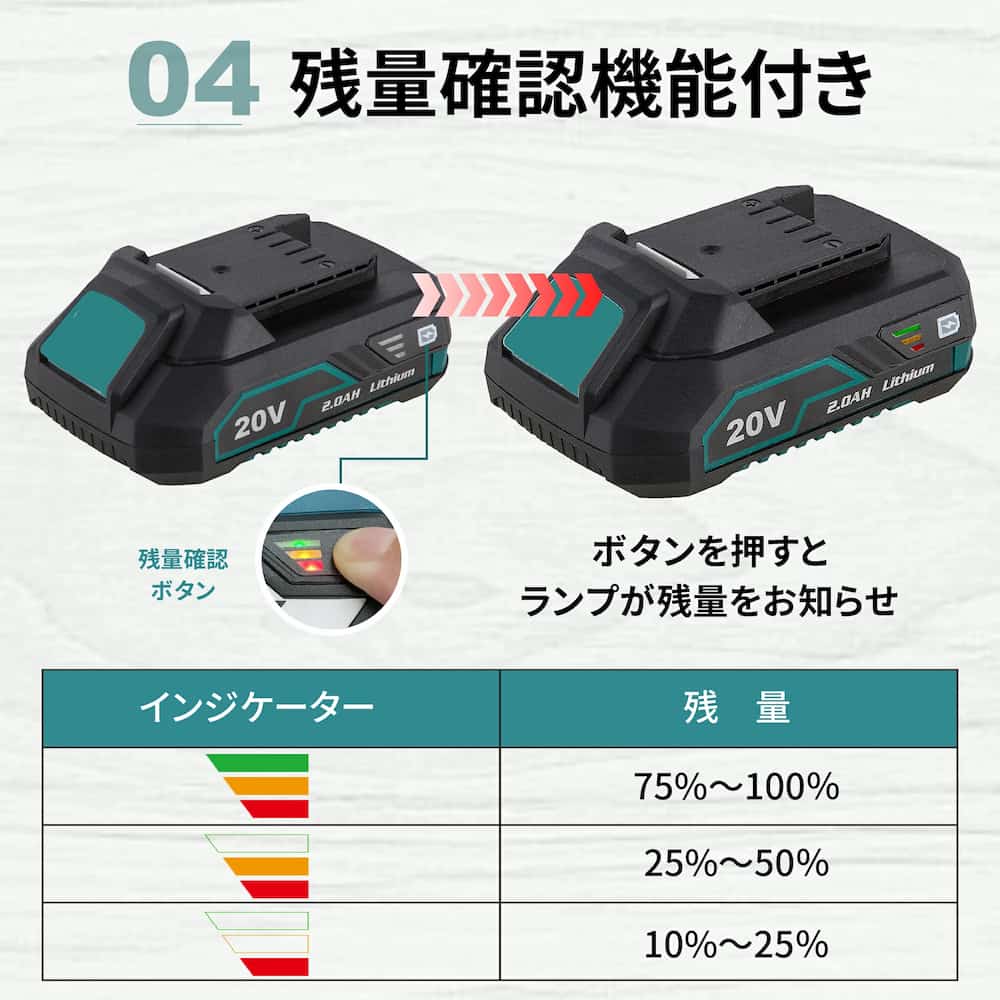 バッテリー表示ボタンを押すとバッテリーの残量が確認できます。電池パック内に制御回路を搭載し、電池セルを個別に監視。使い過ぎ(過放電)や高温になる前に給電を自動停止して電池を保護します。