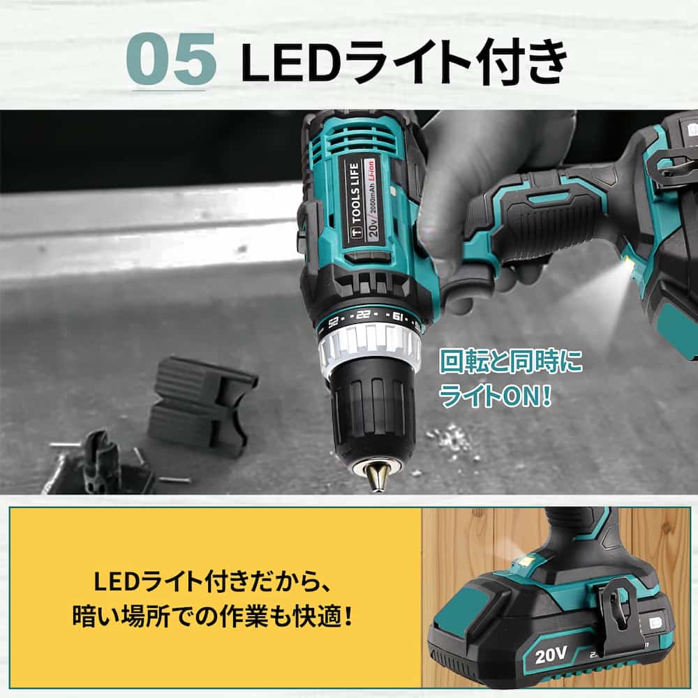 電動ドリルには、25+1段階トルク調整と穴あけ機能が付きます。本製品は木、金属、プラスチック及びドライバーのすべての活動を掘削するために使用することができます。最大トルクは35Nmです。充電式リチウムバッテリー20V2000mAhと急速充電器を搭載してます。約1時間でフル充電になります。