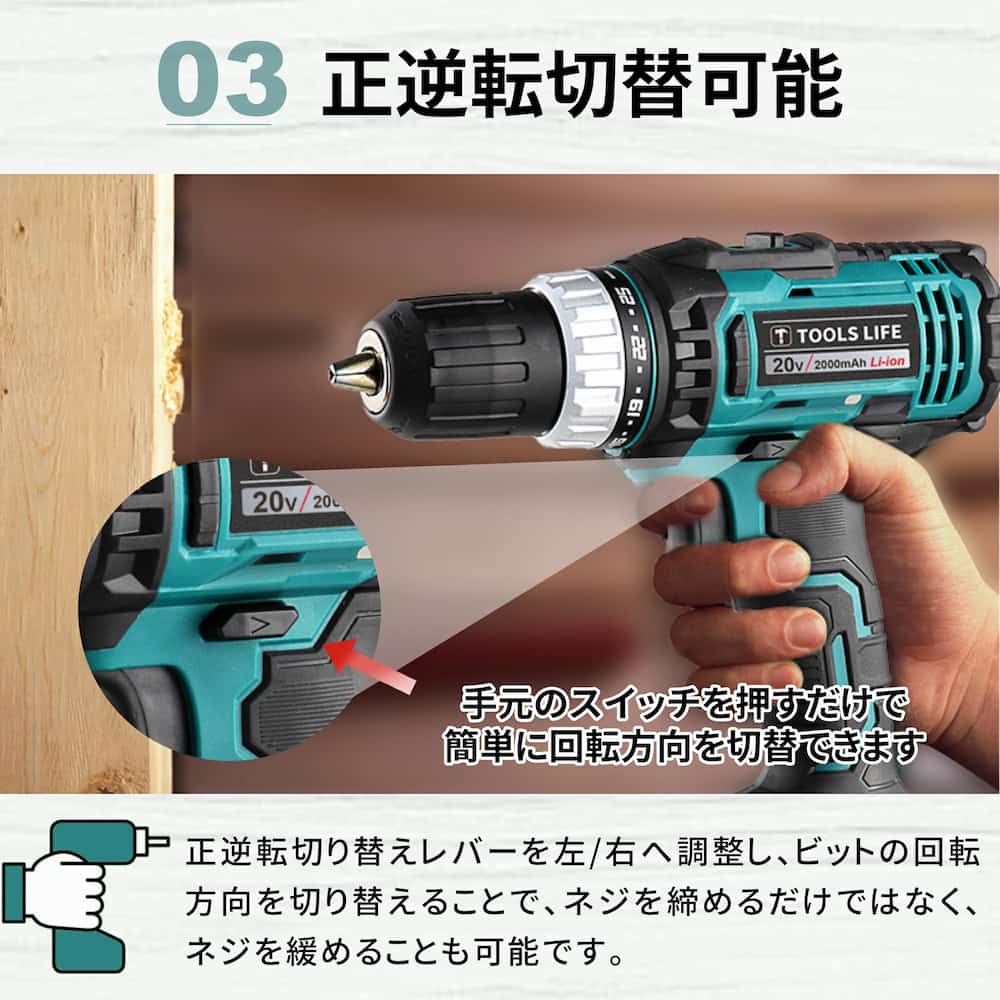 時計回り/反時計回りを切り替えるスイッチがあって、ネジ締めとネジ緩めが簡単にできます。
