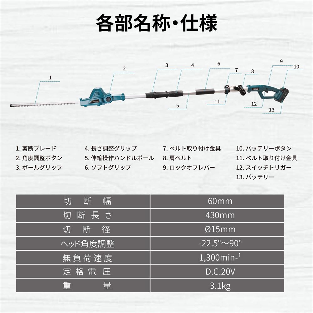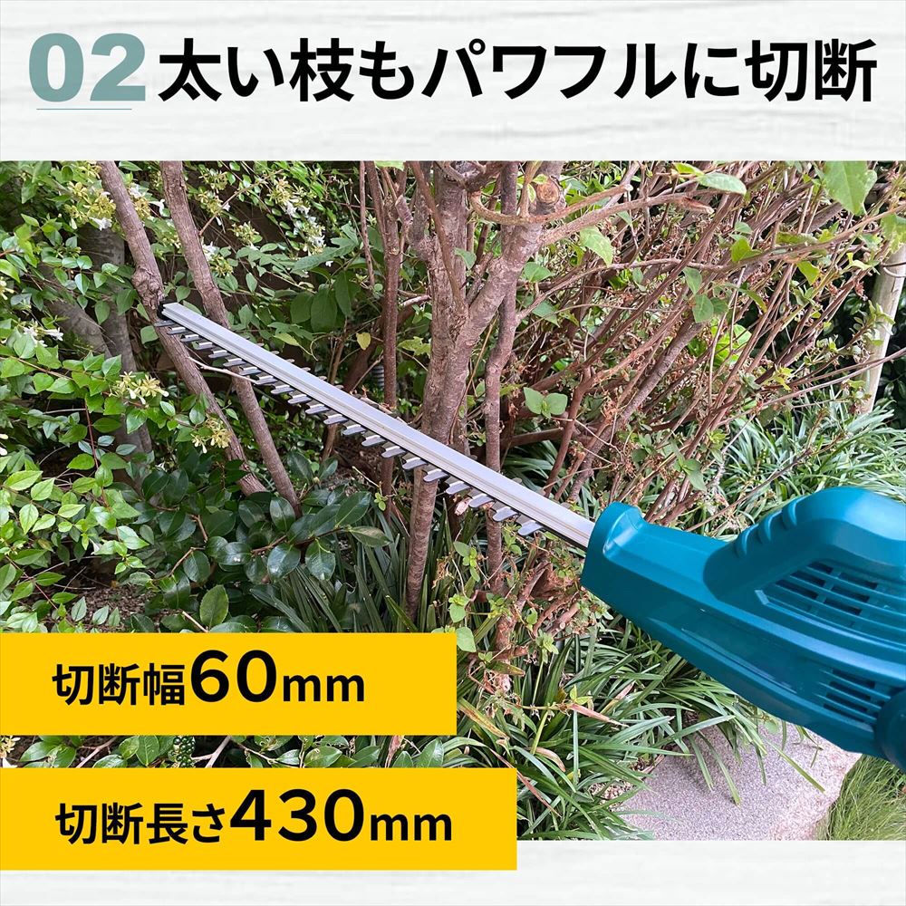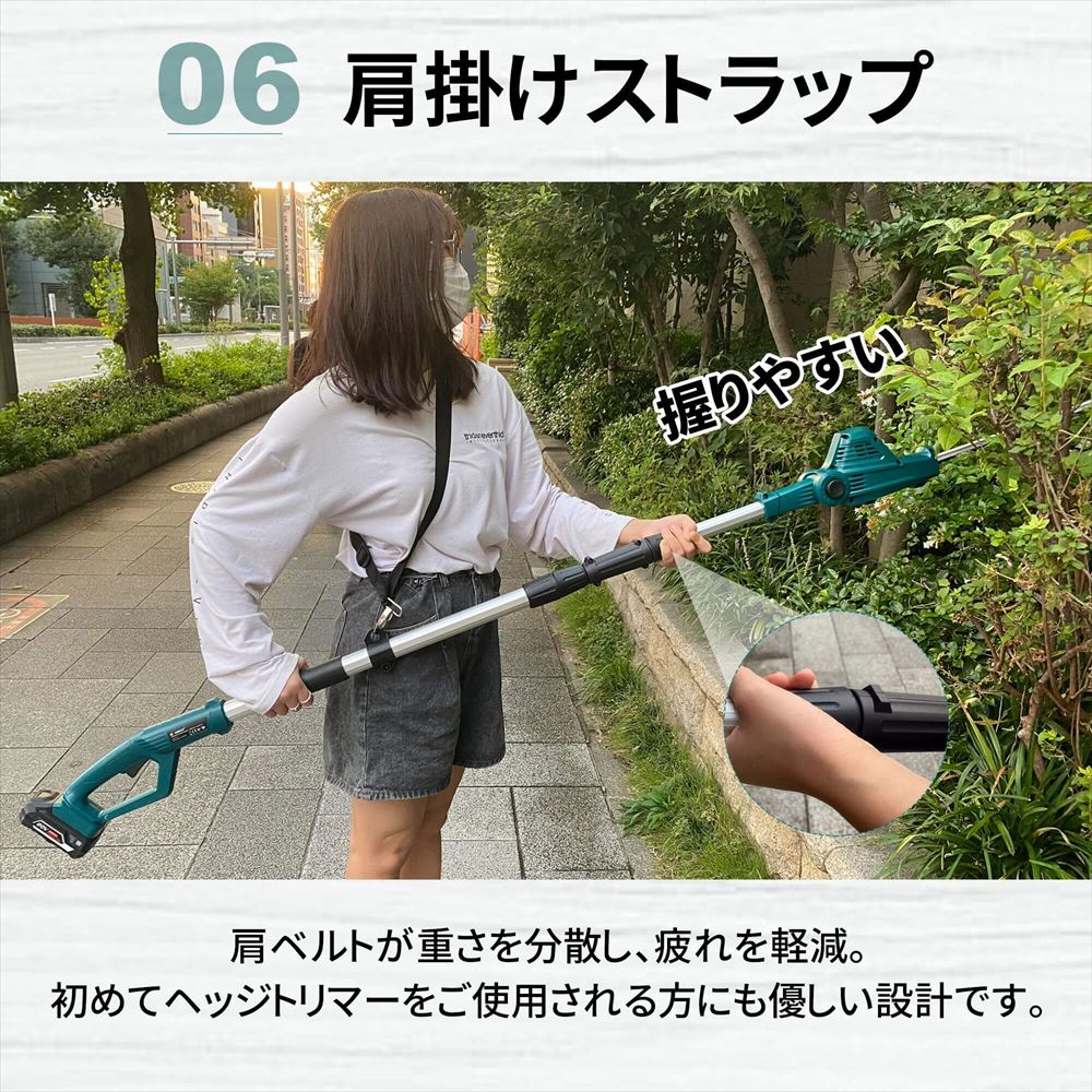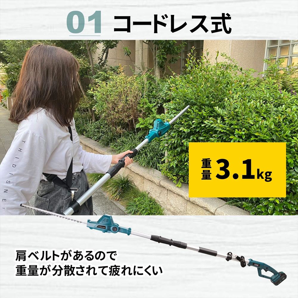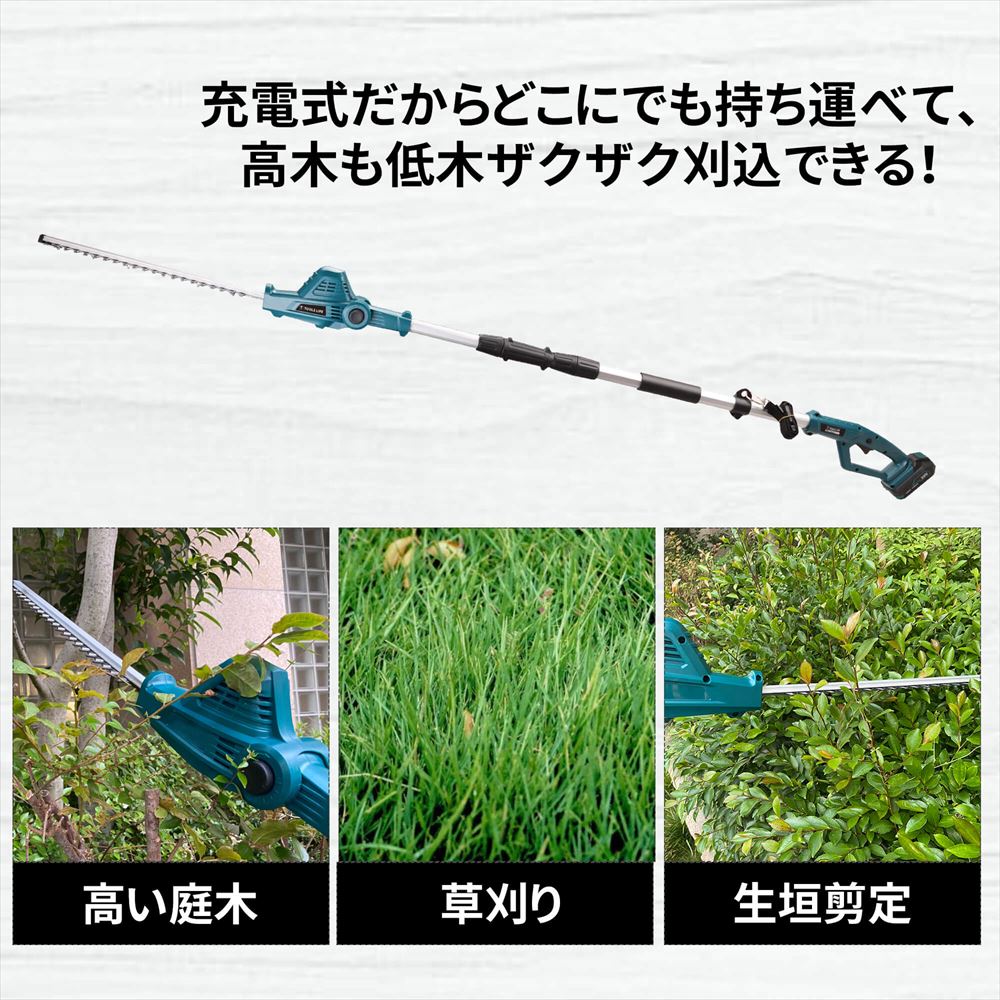 電源のない場所でもご使用いただける充電式高枝ヘッドトリマーです。もうコンセントの場所の心配を現場でする必要なし!