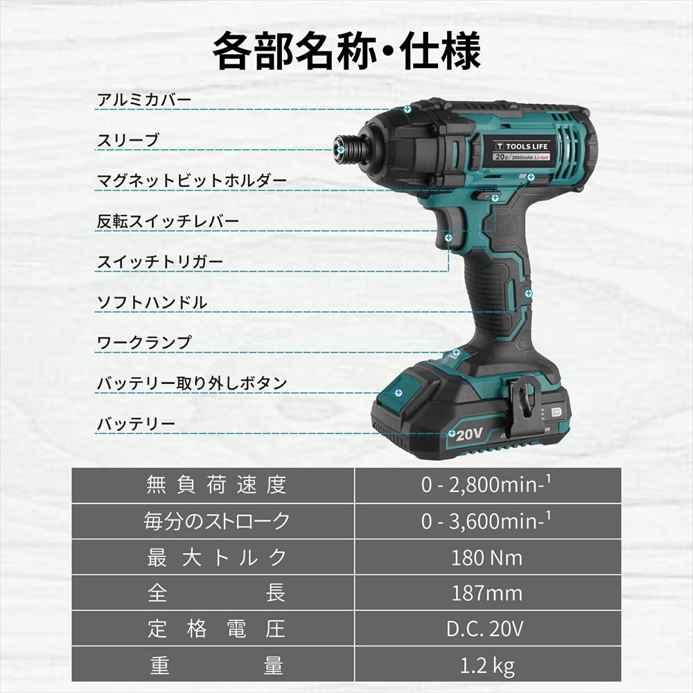 インパクトドライバー:頼れるインパクト! ハイパワー180Nm、全長187mm、軽量1.2 kg