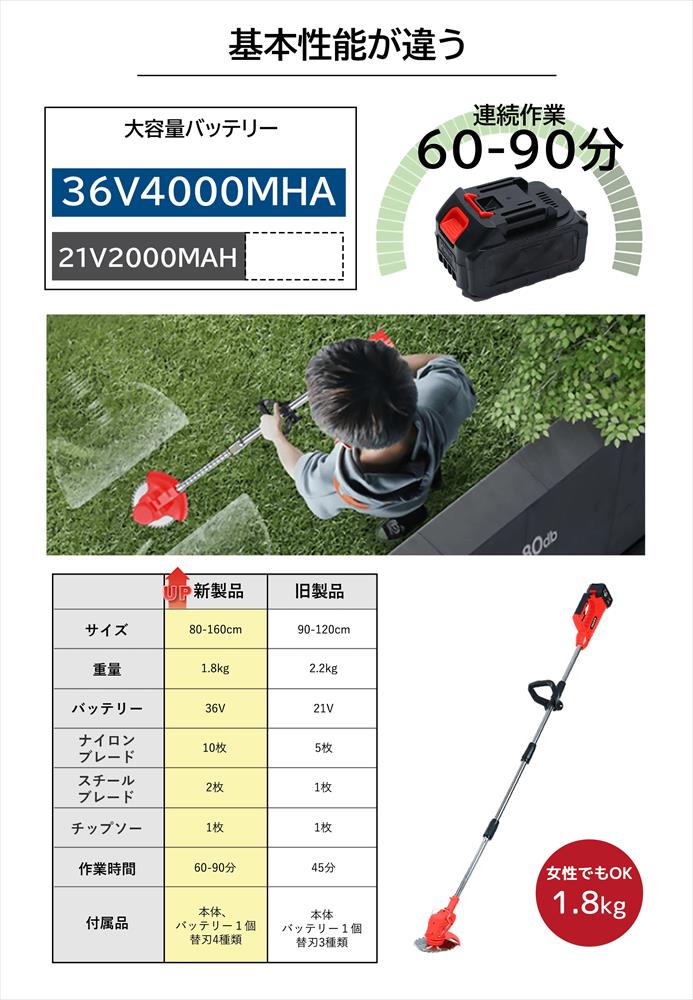 取り外しできるので、縮小するすれば車での持ち運びも便利です。倉庫やちょっとしたスペースへの収納にも邪魔になりません。収納サイズ約53cm×24cm×20cmです。リチウムイオンバッテリー搭載 約60-90分の連続運転が可能。 広範囲の刈り込みにも活躍! 4000mAhのバッテリー 4000mAhの大容量バッテリーが付属されています。フル充電時間は約2時間,約60-90分の連続運転が可能です。