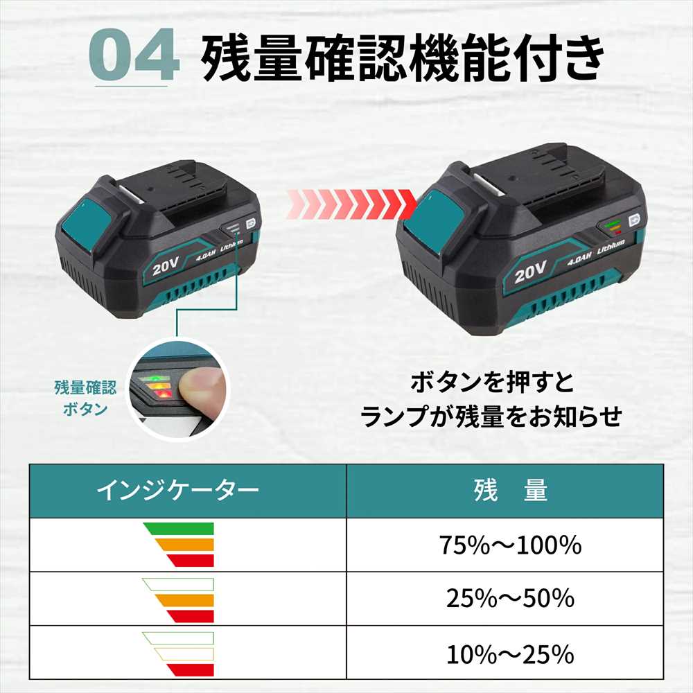 バッテリー表示ボタンを押すとバッテリーの残量が確認できます。電池パック内に制御回路を搭載し、電池セルを個別に監視。使い過ぎ(過放電)や高温になる前に給電を自動停止して電池を保護します。