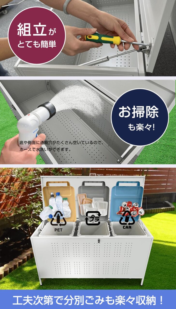 写真のように、35リットルのプラスチックゴミ箱を3つ収納ボックスに入れることで、ゴミの分別が容易になります。PETボトル、食品廃棄物、缶など、異なる種類の廃棄物を簡単に分けて処理することができ、家庭やオフィスでのゴミの分別と管理を効率化します。また、見た目もスッキリと整理され、場所を取らずに収納できます。