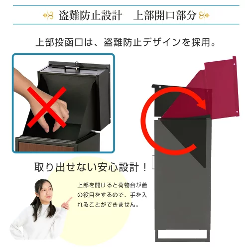 屋根部分は、傾斜があり、雨水が流れ落ちるようになっています。防水素材を使用しているので、雨の日も安心です。 扉部分に騒音防止のクッションを取り付けているので、深夜などの荷物の取出しも扉の音を気にせず取り出せます。扉に防水溝があるので、荷物や手紙等、雨水に濡れることがありません。