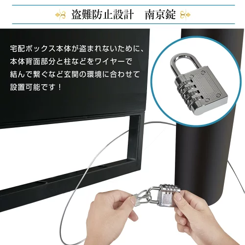 アンカーボルトを取り付けることで、「宅配ボックス付きポスト」が固定され、自然災害等、転倒などを防ぎ安心盗難防止金具に付属のワイヤーを通し、ダイヤル式南京錠をつけることで、2重の防犯対策になり安心