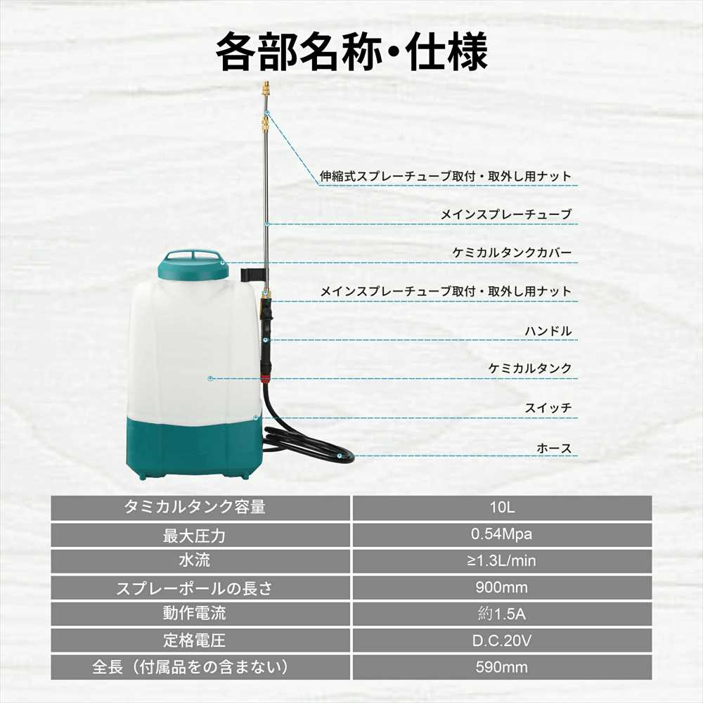 タンクの容量は10Lです。満タンにして、最大60坪の面積に噴霧できます。(使用量によりまず。)