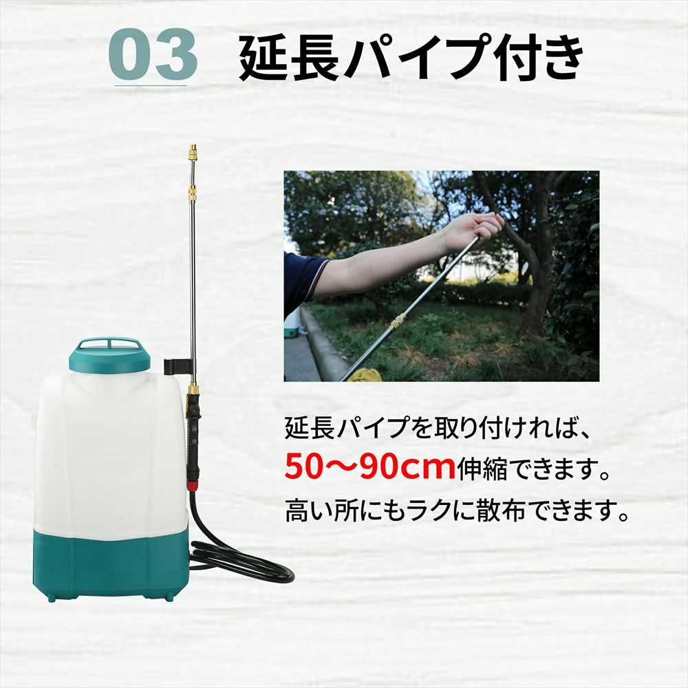 肩掛けベルトがついている背負式の充電式噴霧器です。背負式なので胴全体で本体を支えられ、噴霧時の反動による疲れを軽減するので、作業者中の体の負担に優しいです。